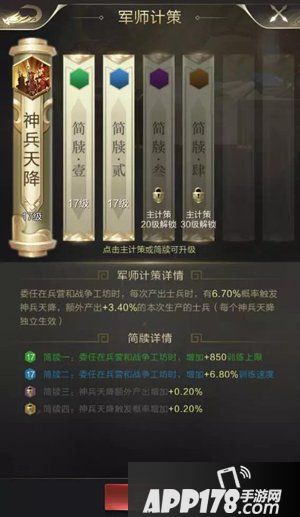 委任在兵营和战争工坊时,每次产出士兵时,有一定几率触发神兵天降,会额外产出一定百分比数量的士兵。