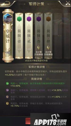 虞姬学会这条计策以后,在守城战斗中每回合有概率触发空城计,所有远程部队提升一定百分比的闪避率!