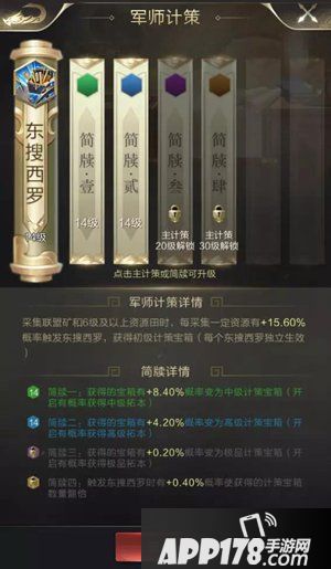 采集联盟矿和6级及以上资源田时,每采集一定资源有一定概率触发东搜西罗,获得初级计策宝箱。