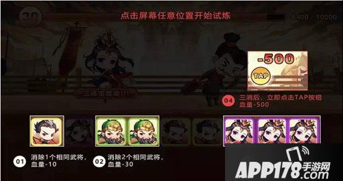 试炼开启后,屏幕下方将从左至右随机出现,三色武将块。点击消除武将块对兵马俑造成伤害。