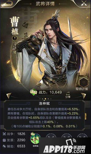 从5星的曹植我们可以看出,虽然委任增加的攻击略少于张良,但是曹植拥有一个不可比拟的特性:拥有曹植,在组队时,自身部队伤害额外提高5.23%