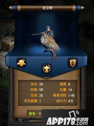 近卫军这一个兵种是游戏中的七级兵种,可以说是游戏中中上层的兵种了,如果玩家拥有足够的此类兵种,那么自身在游戏中就能够站得住了。这一个兵种拥有29点攻击、68点防御、26点生命、8点负重,那么这一个兵种在战斗中的能力是什么呢,让我们一起去了解一下。
