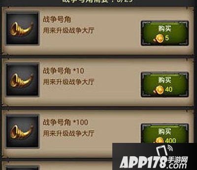 除了打怪掉落以外,战争号角也可以使用金币在商城中购买。在商城中战争号角五金币一个,建议玩家在购买战争号角的时候打包购买,这样花费的金币更少,获得的战争号角更多。另外玩家还可以在城堡商人和每日在线奖励获得这一个道具。运气好的玩家也有可能再幸运宝箱中开到战争号角哟。