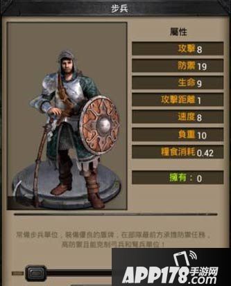 步兵这一个兵种是民兵的进阶兵种,它拥有着民兵的所有能力,比如说盾牌、体魄、铁甲,也是一个合格的坦克。不过步兵的属性就比民兵强很多了,步兵的攻击属性没有提升,但是防御、生命属性得到了大幅度的提升,这样步兵在战斗中就会变得更肉。