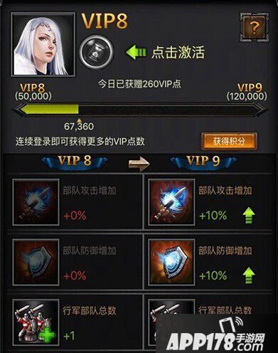 VIP的特权会随着VIP等级的提高而增多,玩家可以点击人物头像旁的【VIP】按钮,进入VIP界面后即可查看当前的VIP点数,当VIP点数达到一定数值后即可提升VIP等级。想要提升VIP点数可以使用VIP点数道具,VIP点数道具可以用金币购买,也可以通过各种奖励获得。除此以外,每天登录还会自动获得一定的VIP点数。VIP等级提升后会自动激活一天的VIP特权,不用消耗任何道具。
