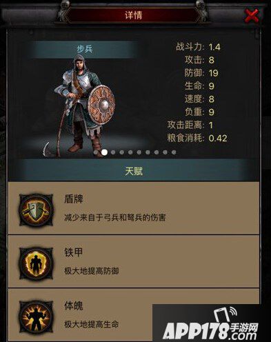 步兵这一个兵种是民兵的进阶兵种,它拥有着民兵的所有能力,比如说盾牌、体魄、铁甲,也是一个合格的坦克。不过步兵的属性就比民兵强很多了,步兵的攻击属性提升不大,但是防御、生命属性得到了大幅度的提升,这样步兵在战斗中就会变得更肉。