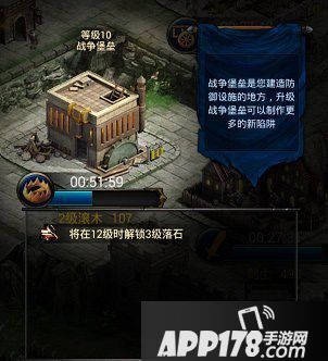 在与偶像中战争堡垒可以让玩家在游戏中建造陷阱,战争堡垒的等级越高,那么玩家可以建造的陷阱也就会更高级。在游戏中陷阱可以让敌方单位早攻击我们的时候损失大量的兵力,如此一来我们就可以很好的砸守城站中获得胜利。