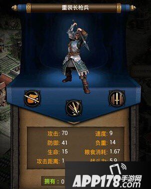 这一个兵种拥有着极强的输出能力,但是自身的生存能力比较弱,但是如果队伍中有着近卫兵,那么其实力依旧可以发挥出来。就这一个兵种的属性而言,他属性游戏中的高端输出兵种了,在中后期都是不可缺少的,所以玩家前期不要出低级的枪兵,直接等兵营升级到二十一级出重装长枪兵就可以了。