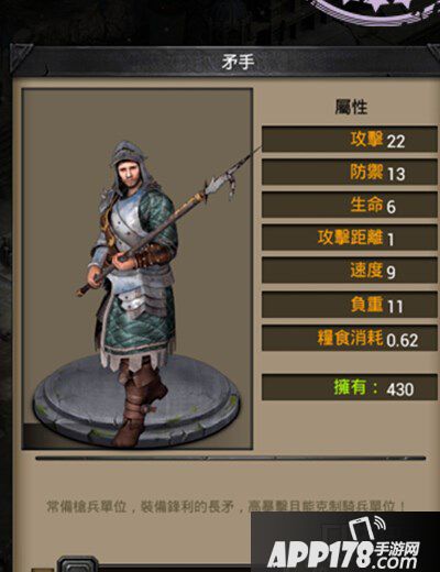 矛手攻击22、防御13、生命6、攻击距离1、速度9、负重11、粮食消耗0.42。