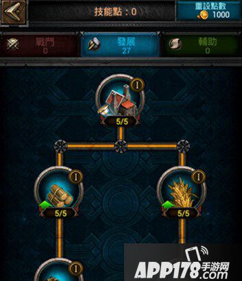 「发展」型天赋除了『丰收』及『资源保护』二项主动技能,其余的效果都是被动增加资源的生产及采集效率,为无法经常在在线的玩家提供稳定发展,『打发时间』的玩家全部无脑点满就好。