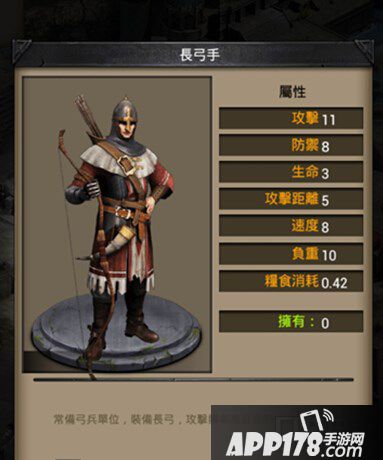 长弓兵攻击11、防御8、生命3、攻击距离5、速度8、负重10、粮食消耗0.42。