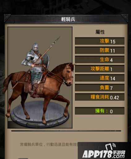 轻骑兵攻击15、防御11、生命4、攻击距离1、速度14、负重7、粮食消耗0.42。