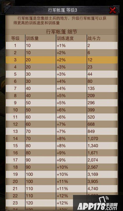 而对于行军帐篷的具体建造数量,由于前期任务指引就已经建造了5个行军帐篷,差不多后面加1-2个就可以了,由于农田和伐木场等其他建筑也需要一定的数量。至于等级的话,差不多4-5级就可以基本保证军队的数量和训练速度了。