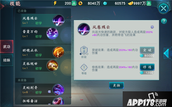 我们在玩《陆小凤传奇》的时候,点击功能导航栏中的【技能】按钮,就进入到技能养成系统。系统里提供了两种养成玩法,包括:武功、经脉通过不同的选择,可以个性化改变技能的效果和角色额外属性效果。