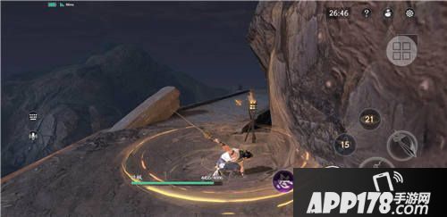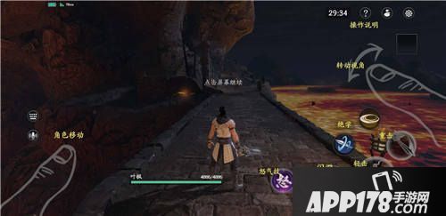 打斗界面右侧是技能位置以及选择敌人的锁定键的位置。左侧滑动可以控制角色的移动方向,紫色技能是一个怒气技,当玩家达到一定的连击数量时可以释放怒气技,也就是俗话说的大招,伤害是最高的,在积累的时候玩家可以注意怒气技能的变化。