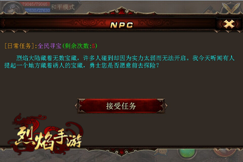 寻宝,除了要有一颗无畏死亡的心之外,还需要拥有能与死神抗战的能力。在9377《烈焰手游》里,寻宝是一款专门为喜欢冒险,更喜欢财富的高手们所量身定做的惊险玩法。玩家只有达到75级,并拥有藏宝图后,才有资格踏上这场全民寻宝的冒险之旅。而且每天可以免费寻宝五次,机会不容错过?快点来参加吧!
