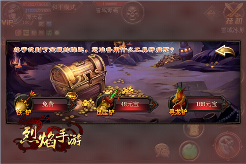 当玩家历经艰辛,克服重重挑战,终于找到宝藏的踪迹,也就是到达指定的寻宝点后,真正的挑战才刚刚开始。玩家可选择铁铲、觅宝铲或寻龙铲来开启面前的宝藏。选择任意一种都会触发随机事件。运气较好的玩家可直接获得极品道具、经验或金币的奖励。