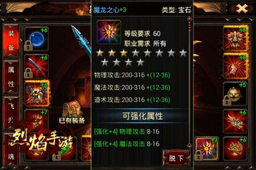 在9377《烈焰手游》里,宝石可以说是一件杀敌的装备,而不仅仅是一个可有可无的附件。宝石并不是镶嵌在装备上,而是以一支独立的力量,直接像装备一样佩戴在身上。攻击属性就会直接加在角色身上,马上见效,使角色的攻击水平更添一筹。