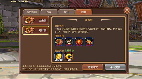 家园就是玩家的自己的领地。在家园你可以尽情的享受这一亩三分地,有地有水,闲暇时,可以种树养花,还能在河边垂钓,都能获得不少的收获呢。除此之外,你还能在家园内举办多人宴会活动。宴会在家园中有四个或四个以上的队友时便可以开启。宴会开启后将会和友好度最高的三人一起享受美味佳肴邀请好友一同享受这宴席大餐。同时一桌豪华的海鲜盛宴还能使玩家获得BUFF,助力你闯荡阿尔特里亚,真是休闲冒险两不误呀。