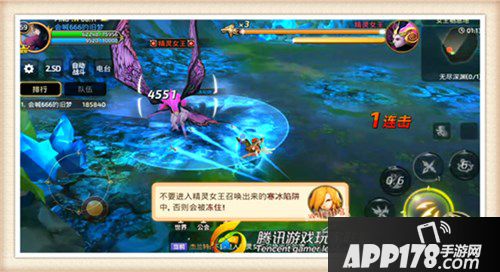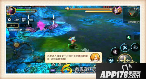 精灵女王Boss的血量在剩余一半后,自身的能力将会大幅度提升,小伙伴们将会面对更加严峻的挑战。上图所示的范围圈就是Boss的冰冻技能,小伙伴们一旦进入其冰冻范围,移动速度将会大幅度削弱,还会持续不断掉血,对我们的干扰效果极大。因此当看到蓝色区域的时候就要格外小心,尽量避免使用“刀锋疾驰”技能,预防误入到Boss的攻击范围中。
