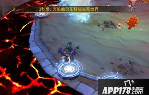 进入地图后我们会看到一个被岩浆包围的圆形地图,地图的周围有4个点,每个点有3个台子,大家需分配好位置,站好之后再开始输出。当BOSS血量下到4X之后会触发第一次岩浆世界,躲过之后继续输出。