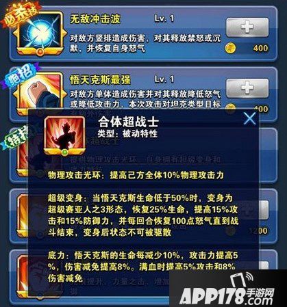 武道会是单挑王者的天堂,一个个看似普通的卡牌却在武道会的舞台上成为了黑马,瞬间满血的人造人20号,强大暴击单秒的孙悟空,套盾驱散额外伤害的比克等等都十分强大。更不用说老牌神卡的单挑能力,无敌高伤害的超贝,反伤回血的布偶,高暴击单秒能复活的沙鲁,都是武道会的霸主。而悟天克斯的降临,会很大程度威胁这些霸主的地位。首先来分析一下悟天克斯的特技,血量越少,攻击和减伤越高,而且血量低于50%变成超赛三,回复25%血量并增加攻防,也就是说如果无法对悟天克斯造成秒杀,就很容易被绝地反杀,残血翻盘。而悟天克斯本身的高成长,让他基础的血量和双防都很高,基本没有办法造成秒杀。而悟天克斯的绝招更是犀利,单体降怒或者减攻击,都能给对方的输出和开大时机进行有效限制,并且对tank造成额外60%伤害,堪称打肉利器,必杀更不用多说,稳定的控制,禁怒或者沉默,强行不给对面机会,并且必杀能回复自身怒气,很容易在武道会中开出第二个大招,造成持续压制。