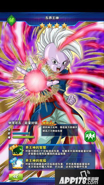 开服不久就出现在了图鉴中,但是一直没有介绍推出。随着游戏更新到布欧篇,这位在龙珠动漫布欧篇里举足轻重的战士终于登场,鉴于他在龙珠动漫里的角色,在游戏里看他的技能也是一个辅助战士,而且是最新一类的三技能卡,这不得不说他在这个方面优于以前的卡。不同于另外两个未推出的战士,界王神技能都已经详细描叙,所以砖家大胆的推测,下一个先降临的将是界王神。