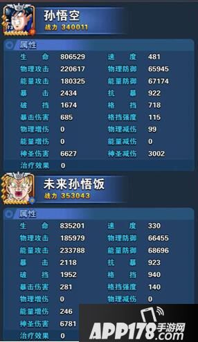 然后未来孙悟饭并不是玩家口中的“黄金脆皮鸡”,可以从下方图中看出,几乎同战力的孙悟空和未来孙悟饭在血量、防御等方面基本相同,既然很多玩家可以选择将孙悟空放在前排,那为什么不能接受一个能在3回合内至少提升自身攻击力35%并降低对方攻击力的未来孙悟饭呢?
