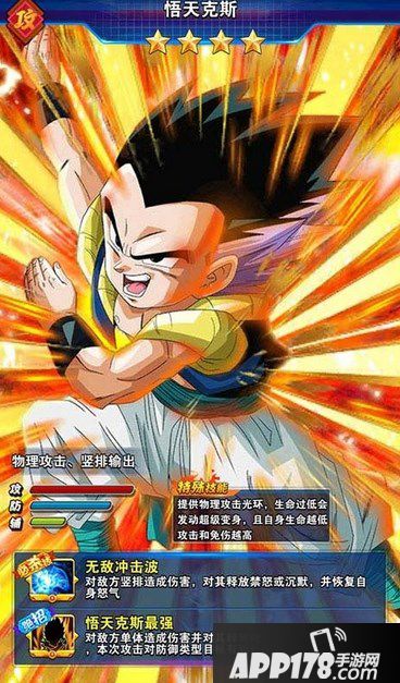绝招-悟天克斯最强:对敌方单体造成(物理攻击*135%外加随等级提高的基础伤害),并对其释放降低怒气200点或降低攻击力10%两回合的DEBUFF效果,本次攻击对防御类型目标伤害提高60%。