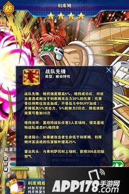 战队先锋:格挡强度提高5%,格挡成功后,对攻击这造成相当于利库姆攻击力30%的伤害(伤害受伙伴阵位攻击加成,不受战斗中BUFF加成),并降低其5%攻击力、5%防御力2回合,降低攻防效果可叠加10次。
