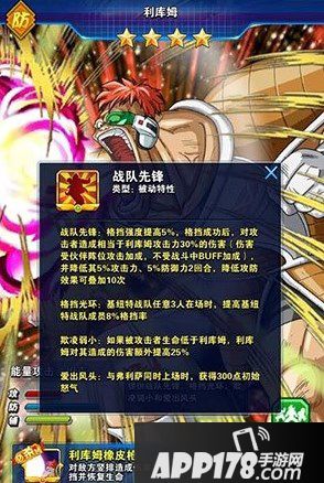 战队先锋:格挡强度提高5%,格挡成功后,对攻击这造成相当于利库姆攻击力30%的伤害(伤害受伙伴阵位攻击加成,不受战斗中BUFF加成),并降低其5%攻击力、5%防御力2回合,降低攻防效果可叠加10次。