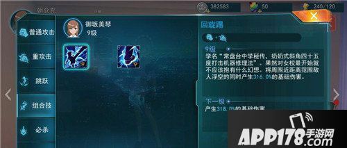 组合技:回旋踢;美琴的招牌技美将周围近距离范围敌人浮空的同时产生316.0%的基础伤害。
