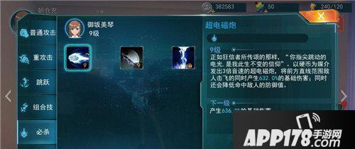 一技能:超电磁炮(美琴独家技能)美琴一硬币为媒介发出3被超音速的超电磁炮,并将前方直线范围敌人击飞的同时产生632.0%的基础伤害;同时还会降低命中敌人的防御值。