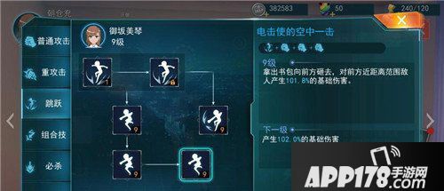 跳跃:电击使的空中一击;美琴拿出书包向前方砸去,对前方近距离范围内敌人产生101.8%的基础伤害。