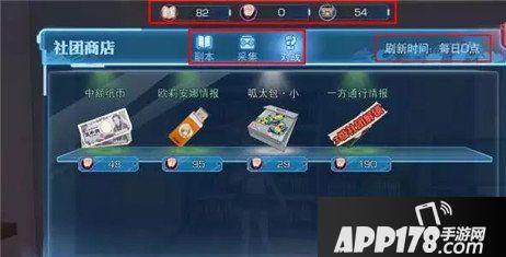 剧情闯关积分(完成副本活动获得)、采集积分(完成积分活动获得)、对战积分(参加社团战斗获得)分别可以在社团商店里兑换不同种类的奖励;每日0点会刷新兑换的奖励。