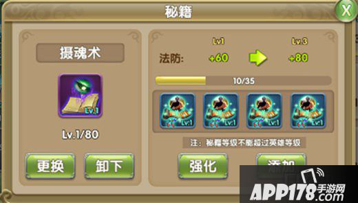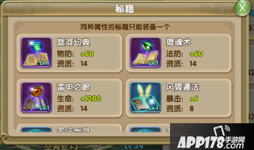 玩家已经获得的每个英雄都可以装备秘籍,秘籍槽中的秘籍可以卸下、替换或者升级。不同的秘籍将给英雄才带来不同的属性加成效果,而秘籍也是有品质之分的,从较低品质的绿色,到最高品质的红色,秘籍品质越高其经验就越多。同时,秘籍还可以通过吞噬其他秘籍来提升自身等级,不过只有当英雄达到一定级别之后,才能够将自身装备的秘籍升级。