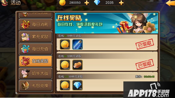 点击我们的【活动】按钮就可以看到在线奖励。例如下图。
