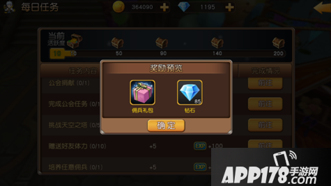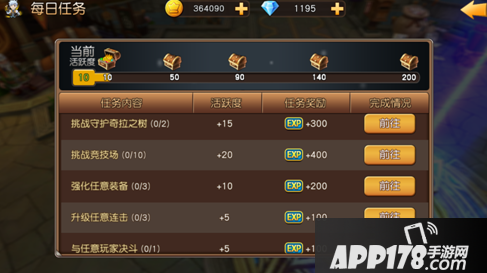 【每日任务】会不定期更新,每天全部完成,可以获得最后的钻石大奖。点击【前往】,系统将自动将您带入具体的任务中,完成它不仅可以得到宝箱奖励,还可以得到丰厚的经验奖励哦。