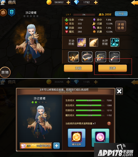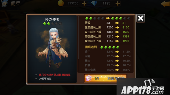 当你获得一个佣兵时,除了提升它的装备之外,还可以培养佣兵至佣兵转生,转生可以大大增加佣兵的能力上限。