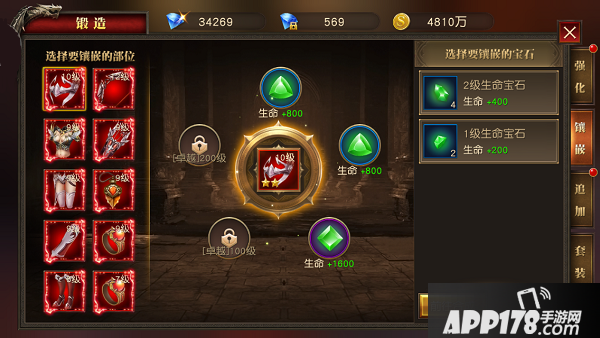 点击锻造进入镶嵌界面。玩家通过在装备槽孔上镶嵌对应宝石,提高人物属性和战斗力。每个装备部位都可以进行宝石镶嵌。宝石镶嵌跟随部位,更换相同部位装备时,宝石会一同继承。