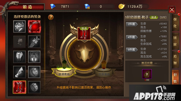 4.更换装备时,如果装备已经激活套装属性,将返还所有已经消耗的材料。更换同阶装备直接继承套装等级。
