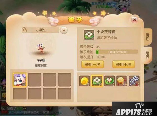 孩子等级达到70/80/90/100总共4次机会,可以通过吃小块茯苓糕或者茯苓糕来获得经验。