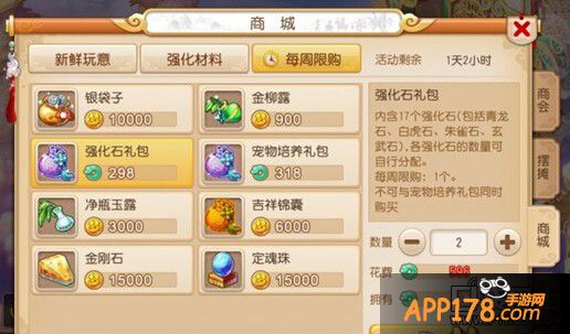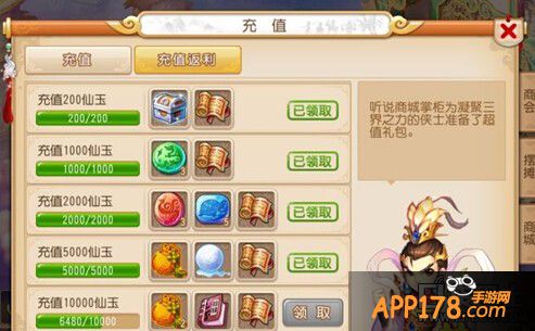 省钱,不是不花钱,充值是为了花小钱省大钱,比如在你为游戏充值了648元之后(强烈推荐只充值这个档次的仙玉,理由很简单——送得多),你就能够领取四层奖励,这能够让你每周获得8个三界群雄的青睐,还能每周以298的超值价格买到一个内含17个强化石,强化石数量可由你自由组合的强化石礼包——而如果以单独的零售价计算,这个礼包要价值整整17*20=340仙玉!所以不要以为充值了你就亏了,在日积月累之下,你能获得更多!