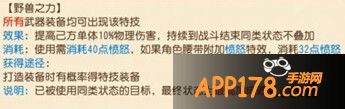 点评:野兽之力一般是在开场的时候使用,只需使用一次可以持续的战斗结束,大大的提升自己的物理输出。如此强悍的特技可谓必不可少。推荐部位头盔、鞋子、项链、铠甲。