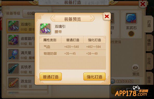 打造分为普通打造和强化打造,想要珍品装备要强化打造,可以看见图中强化打造需要玄武石,关键点来了玄武石怎么获得?