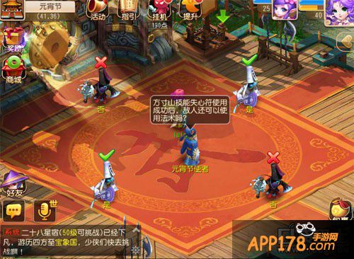 在活动开始后,玩家点击参加活动会被传送至活动场所,活动主持人,会每隔一段时间放出一道是非题,玩家需要和四周"是"和"否"NPC对话选择答案。每天可以猜灯谜20道题目,答对灯谜题后有不菲的奖励,但回答错误3道题目后,会变成小猪哟。