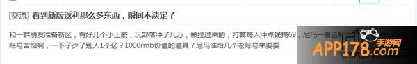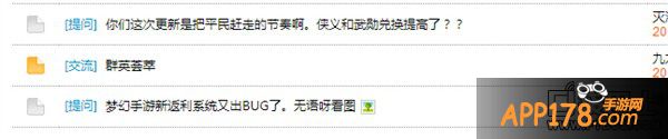 再此次更新过后有玩家在论坛放出统计,很多玩家表示对梦幻的前景堪忧(图没截到帖子没了),小编也不知道官方为何如此执着于返利活动,出了一次大BUG改一改还要上,老玩家虽然值得珍惜,但是新玩家就不是值得挽留么?小编更不知道为何将平民玩家的生存空间一再降低!最后有很多玩家表示论坛上发的帖子就会屏蔽,所以我在这里帮大家问一句,你们是缺钱么?这么着急坑钱?游戏还没公测就要被你们玩坏了!