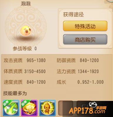 泡泡天生必带连击和高防御技能,且它的各项资质都属于高数值型,是一个极其不错的物攻型宠物。在前期升级快,宠物更新换代快的时候,泡泡绝对是时髦不落后的选择。