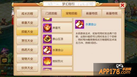 水漫金山的特效是有5%的概率降低对方物理和法术攻击3%,持续效3回合,相对于泰山压顶水漫金山对暴力队伍可是显着实用多了,只要命中那么对方的输出就会直接降低,效果等于是阵法小克后造成的效果,如果你想要将水漫金山的价值发挥到最大值,那么不妨尝试一下高速法宠这个在端游中很少见的法宠加点模式,也许会有新惊喜。