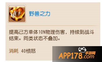 效果:提高自己单体10%物理伤害,持续到战斗结束同类状态不叠加。